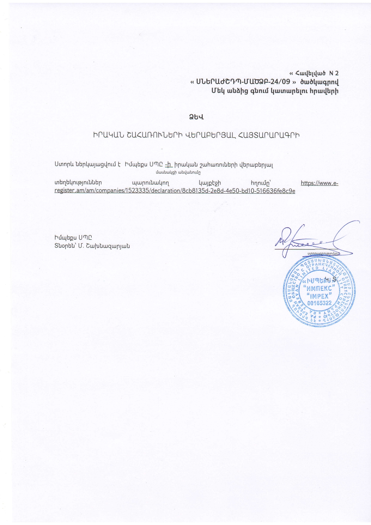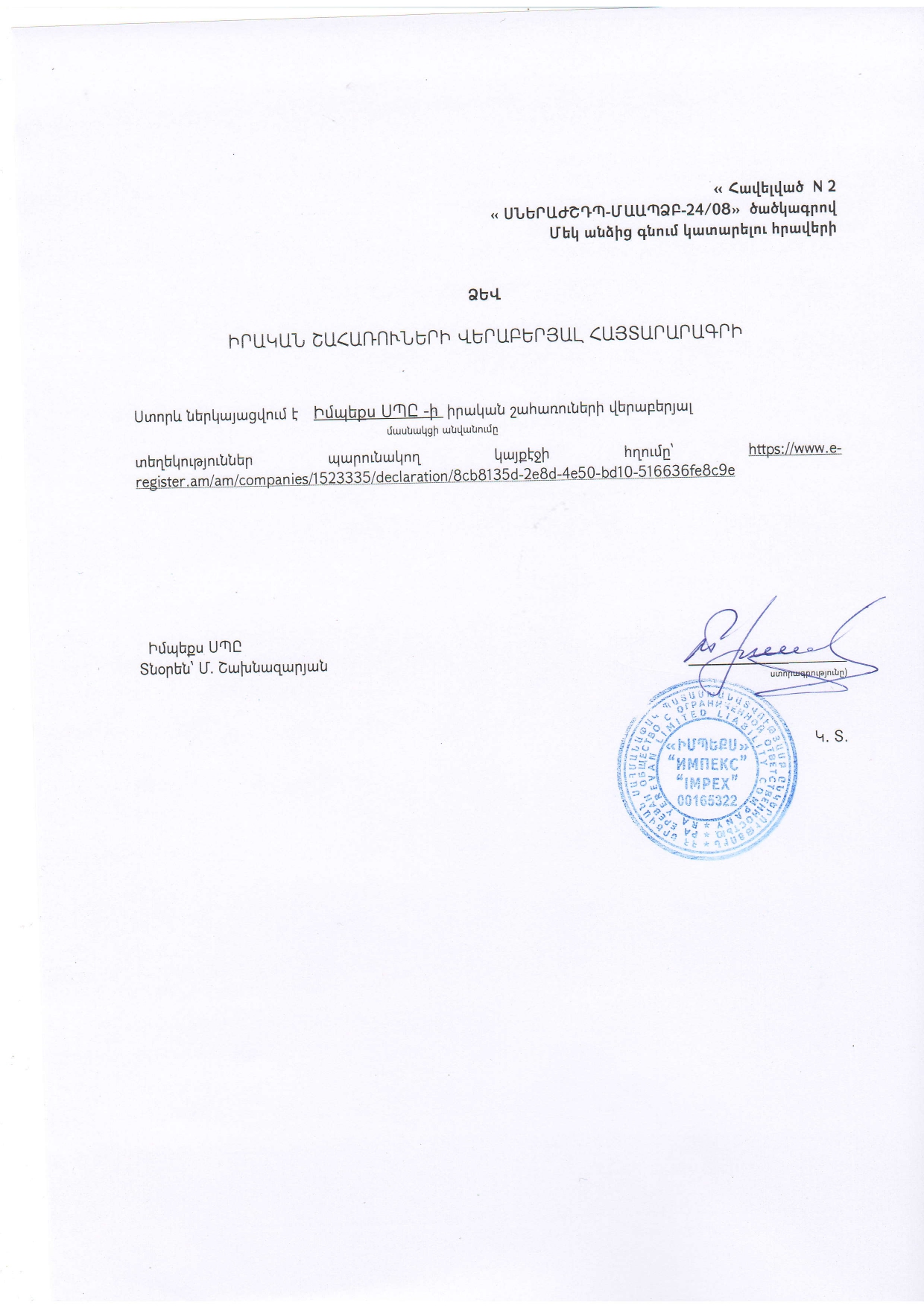 Statement on the data of the real beneficiaries of the participant of the procedure with the code SHMANH-HMAAPZB-24/5 for the purpose of acquiring goods necessary for the needs of Ani municipality of Shirak marz, RA