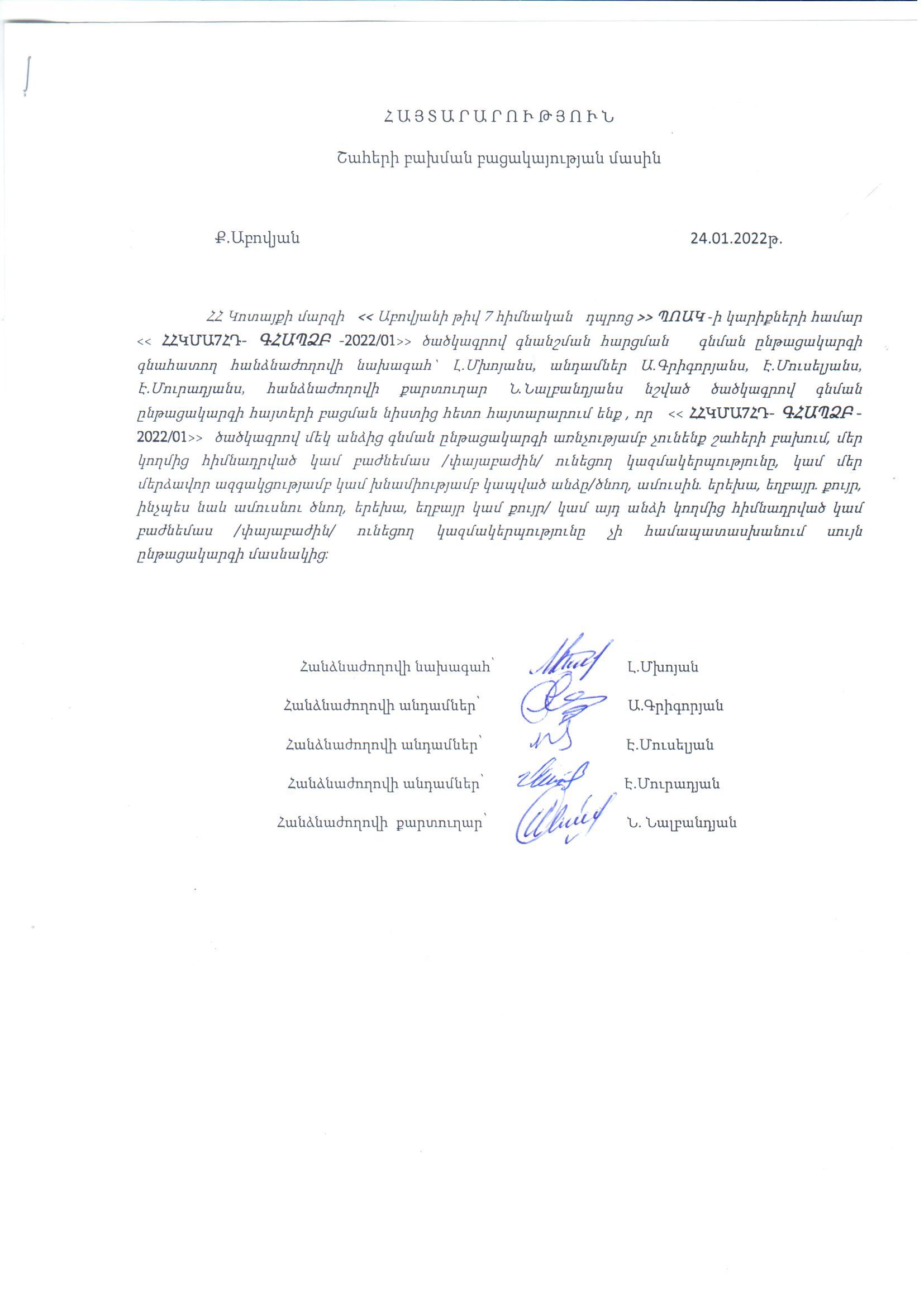 Statement on the absence of a conflict of interest of the SC evaluation committee with the code announced by the Dimitrov secondary school of Ararat region