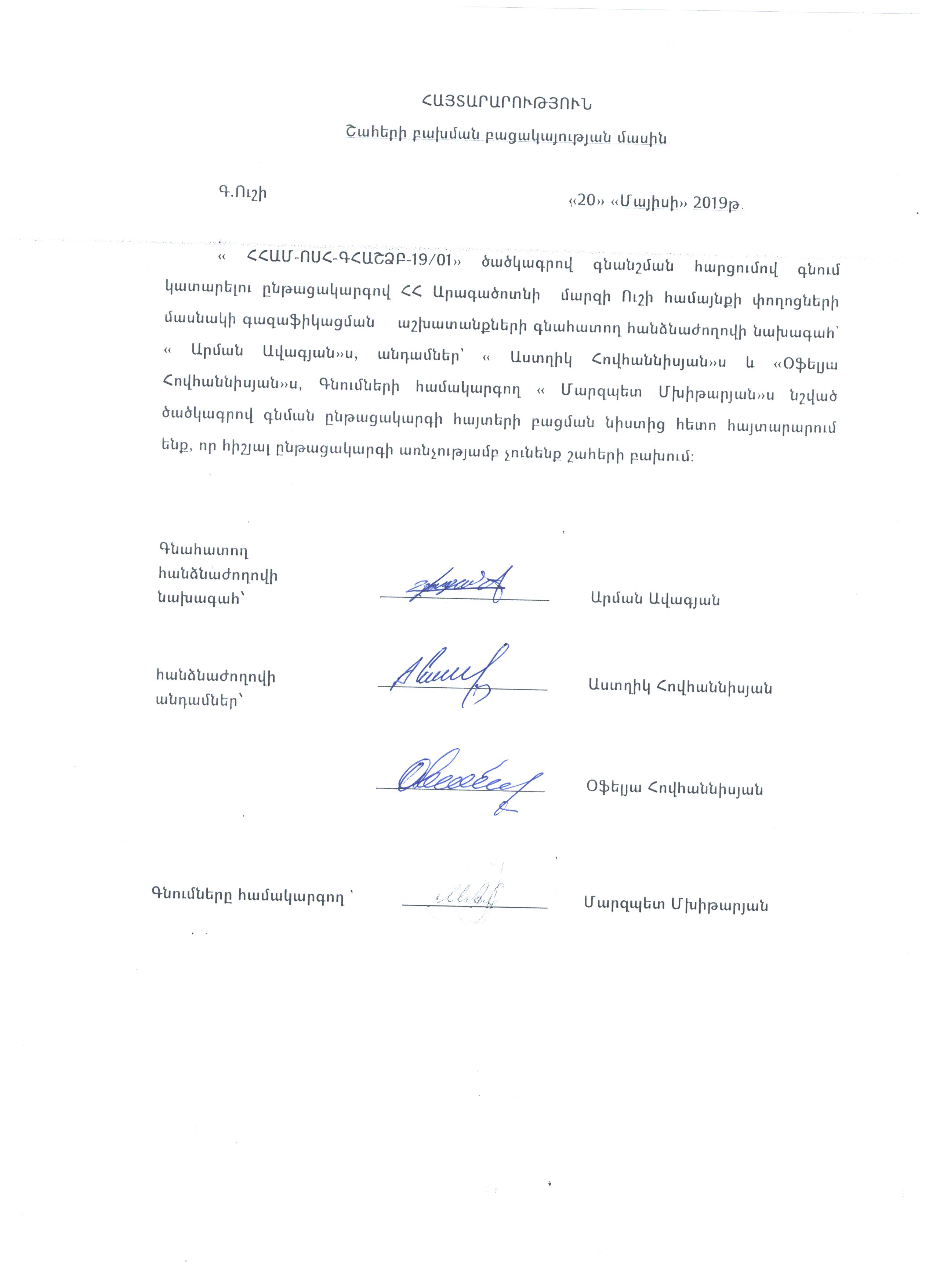 The Ushi municipality of the Aragatsotn Marz below describes the absence of conflict of interest quota for the evaluation quota for the AAMPA-SSH-GHASHZB-19/02 census commissioned for purchasing partial gasification of the community streets for the needs