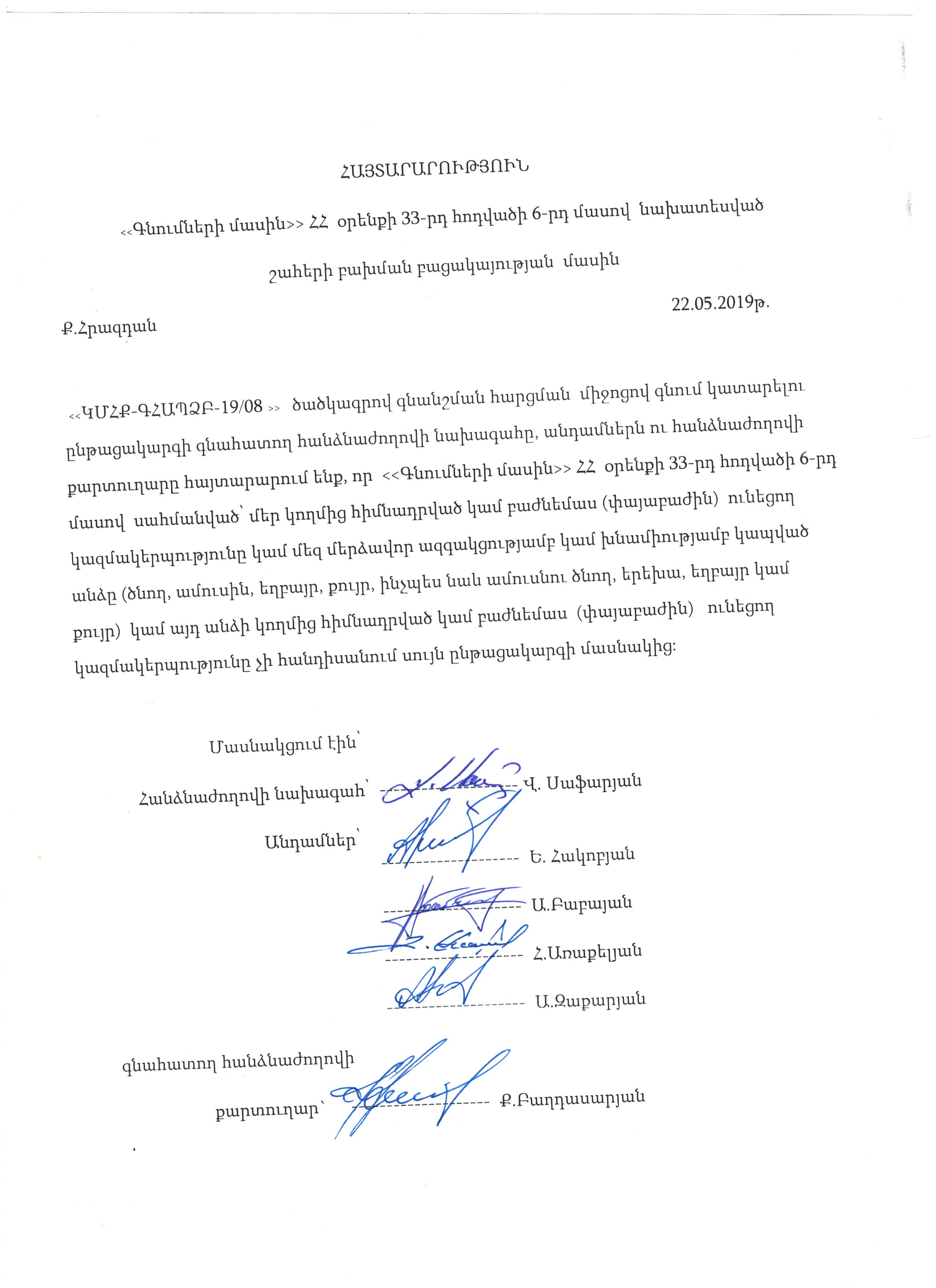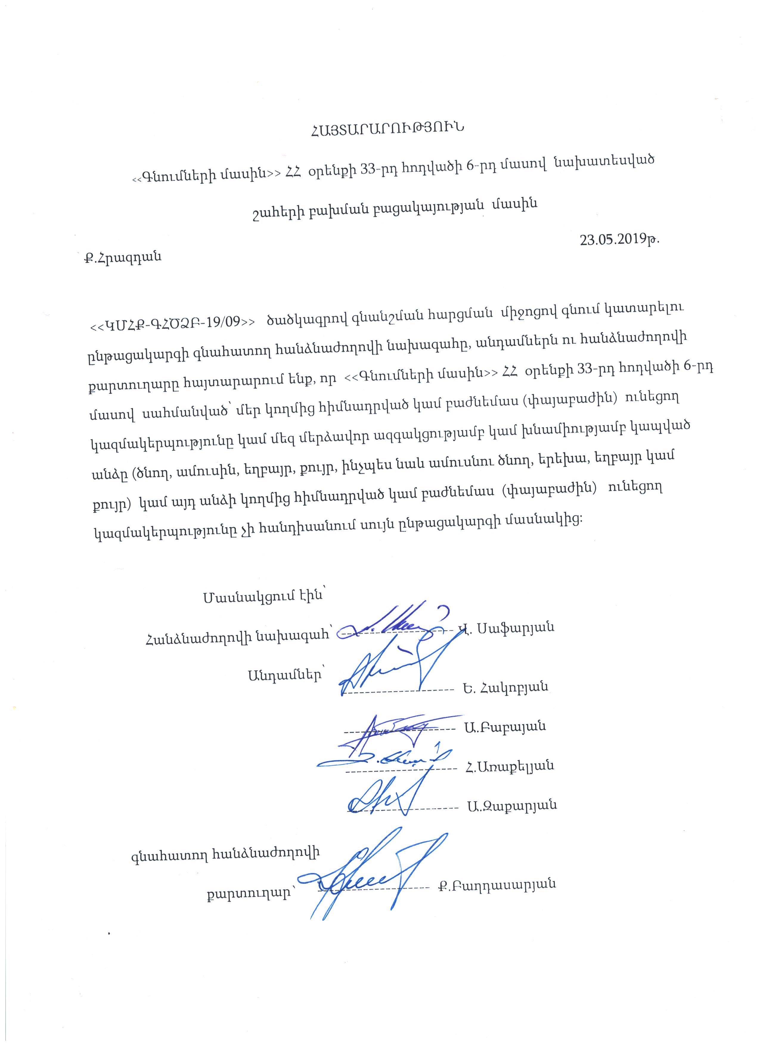 Protocol on the absence of conflict of interests with the code "KNHK-GHSSZB -19 / 09".