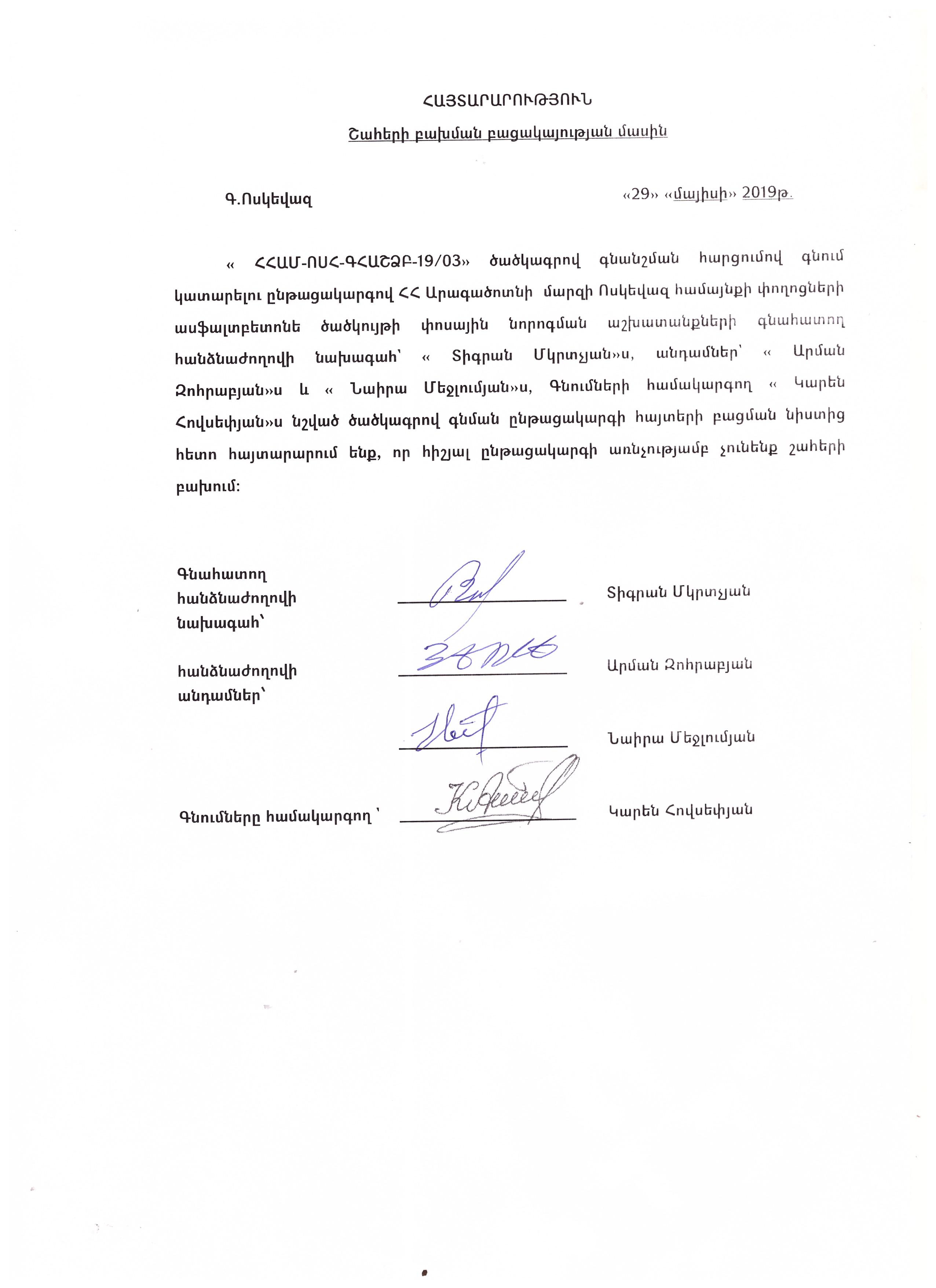The municipality of Voskevaz of the Aragatsotn Marz of the Republic of Armenia below declares the absence of the conflict of interest quota for the evaluation committee of the AAM-TSR-GHASHZB-19/03 code for the repair of the asphalt-concrete pavement of t