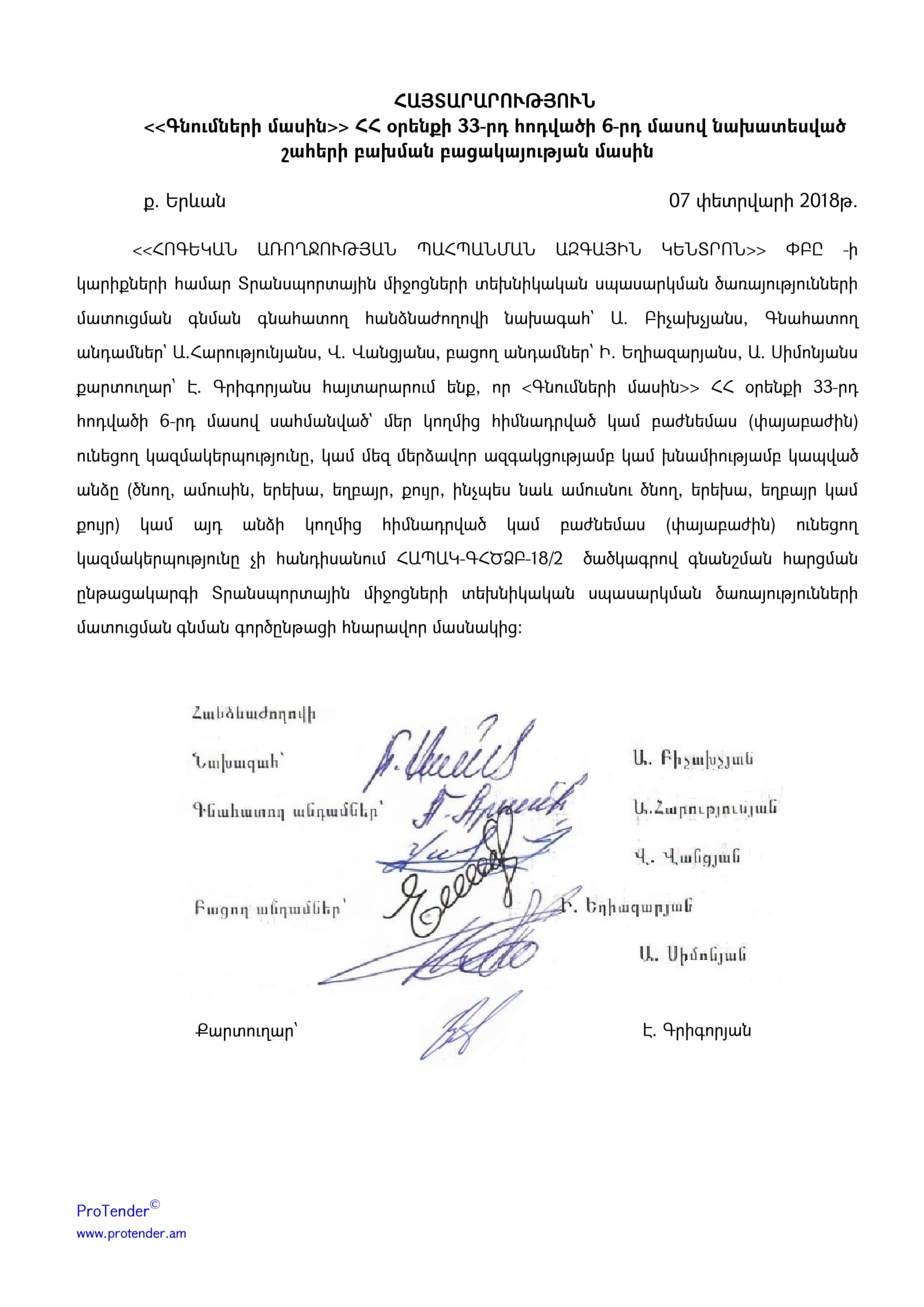 Statement on absence of clash of conflict of interest procedure with ՀՀ ՏՄԻՔԿԾ-ԳՀԱՊՁԲ-18/01 codes organized by Ijevan Municipal Utility Service