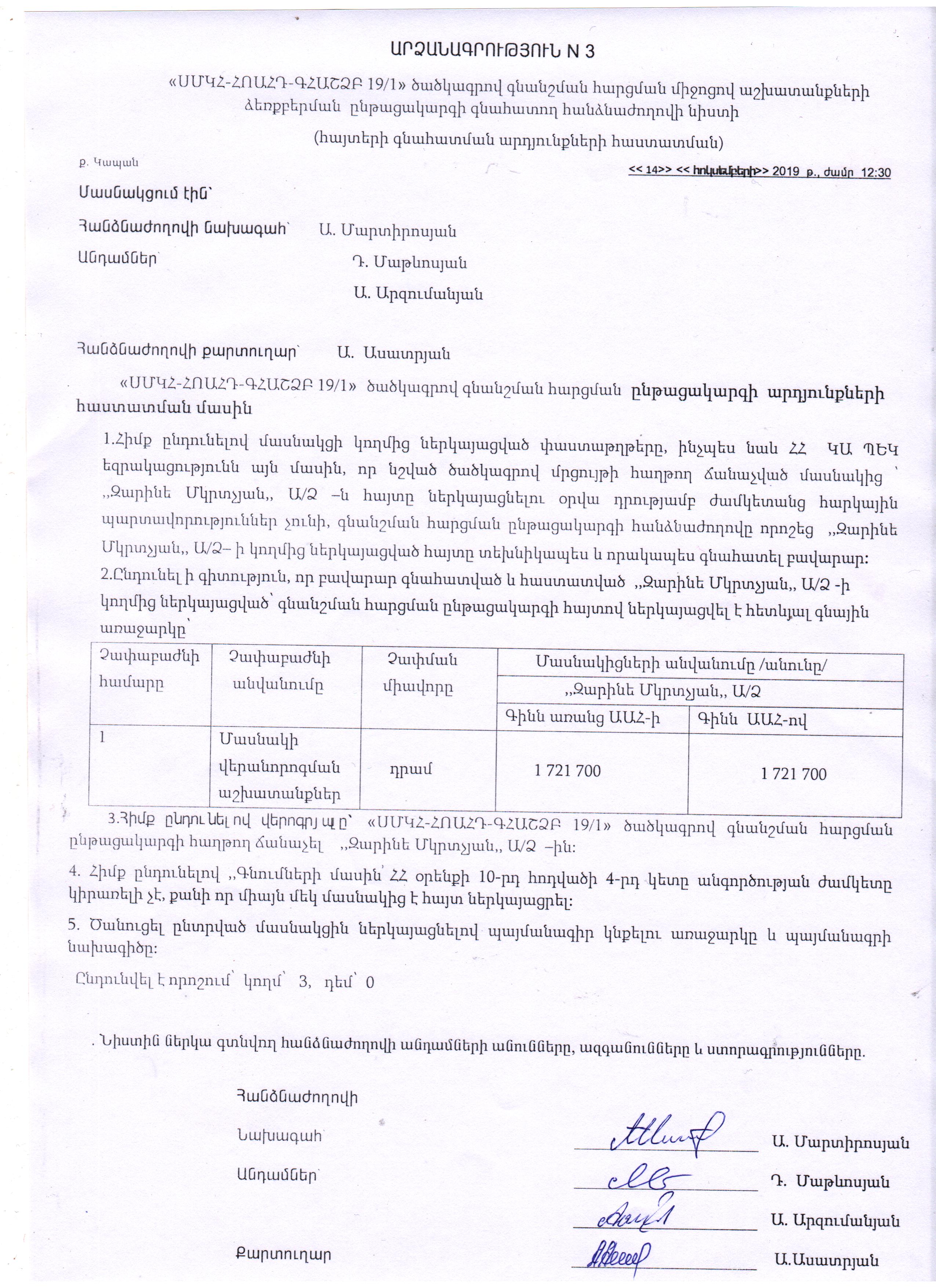 Minutes of the Assessment Commission of the Procurement Procedure under the ԱՄՄՔ-ԳՀԾՁԲ-19/40 for Masis Municipality Needs
