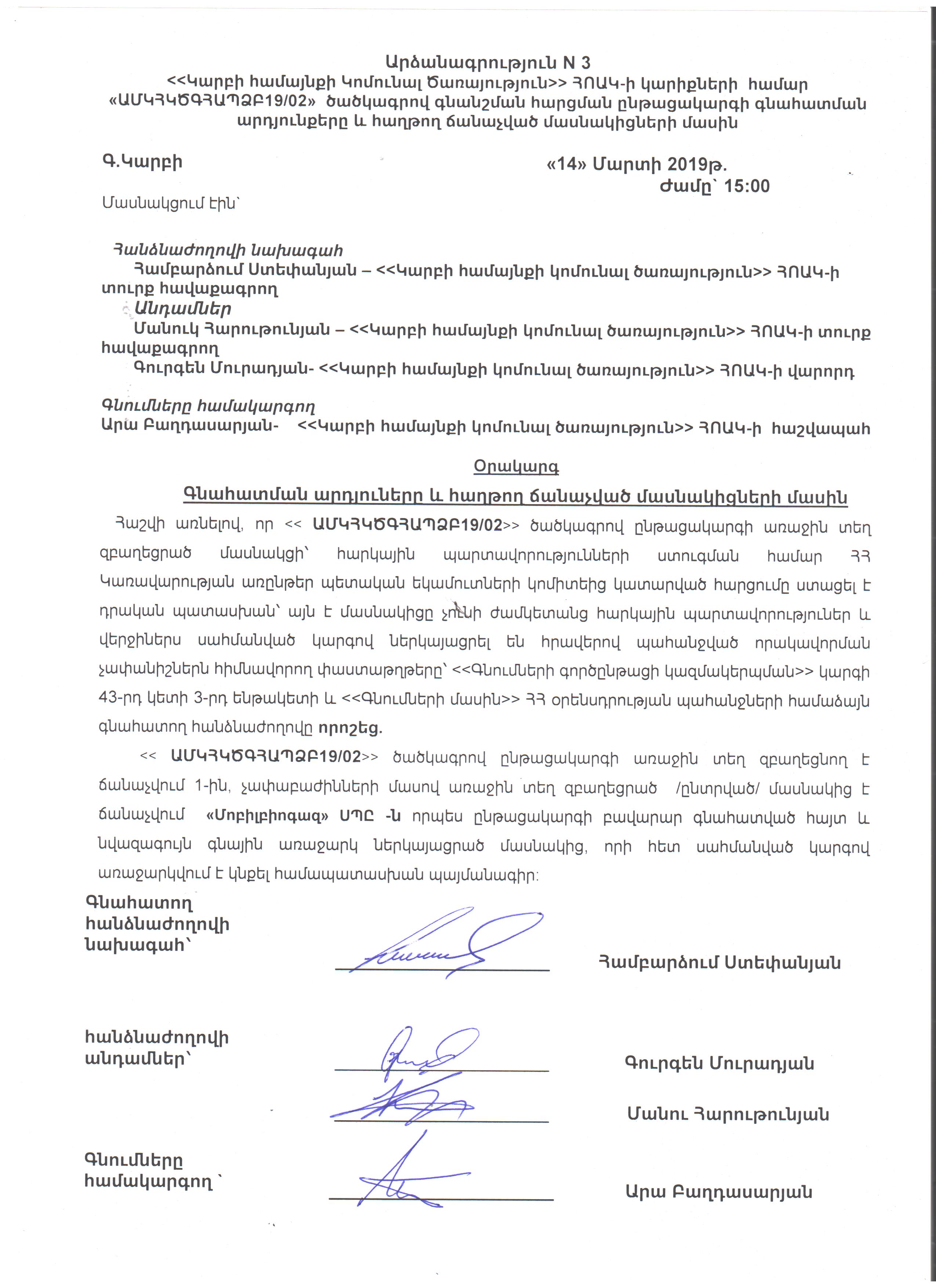 Protoco session of evaluating committee due to ՀՀ ՖՆ-ԳՀԾՁԲ-19/3 code