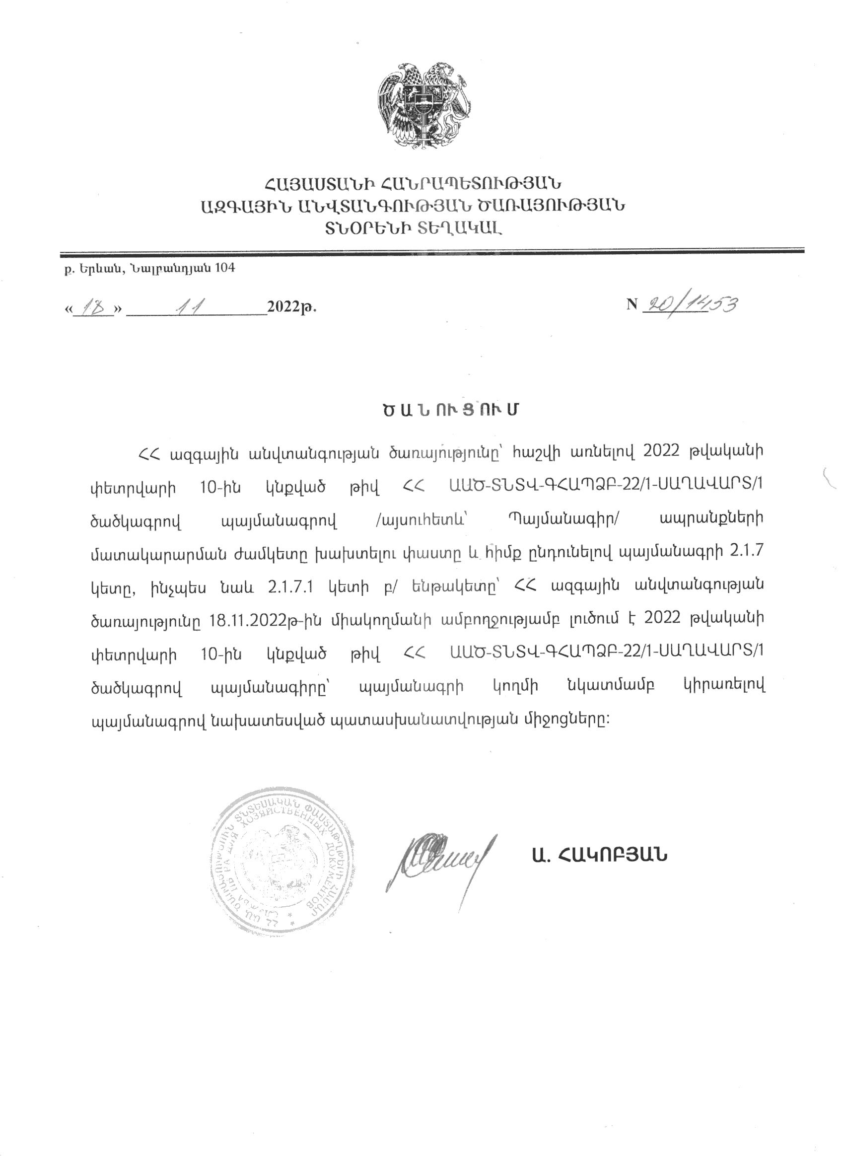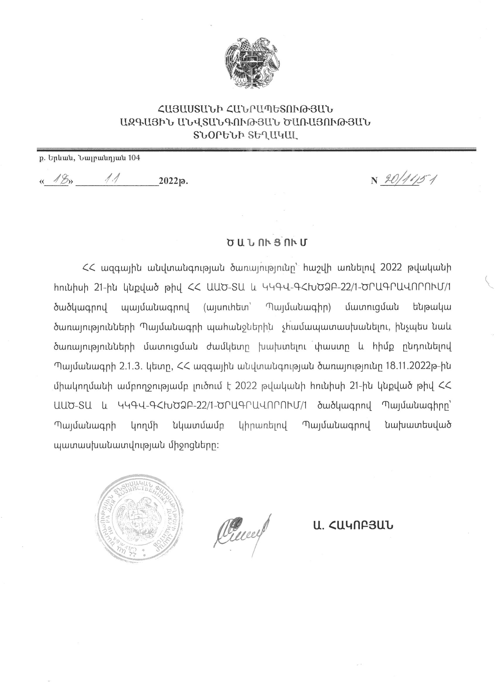 Notification of the full unilateral termination of the contract under the code ՀՀ ԱԱԾ-ՏՆՏՎ-ԳՀԱՊՁԲ-22/1-ՍԱՂԱՎԱՐՏ/1