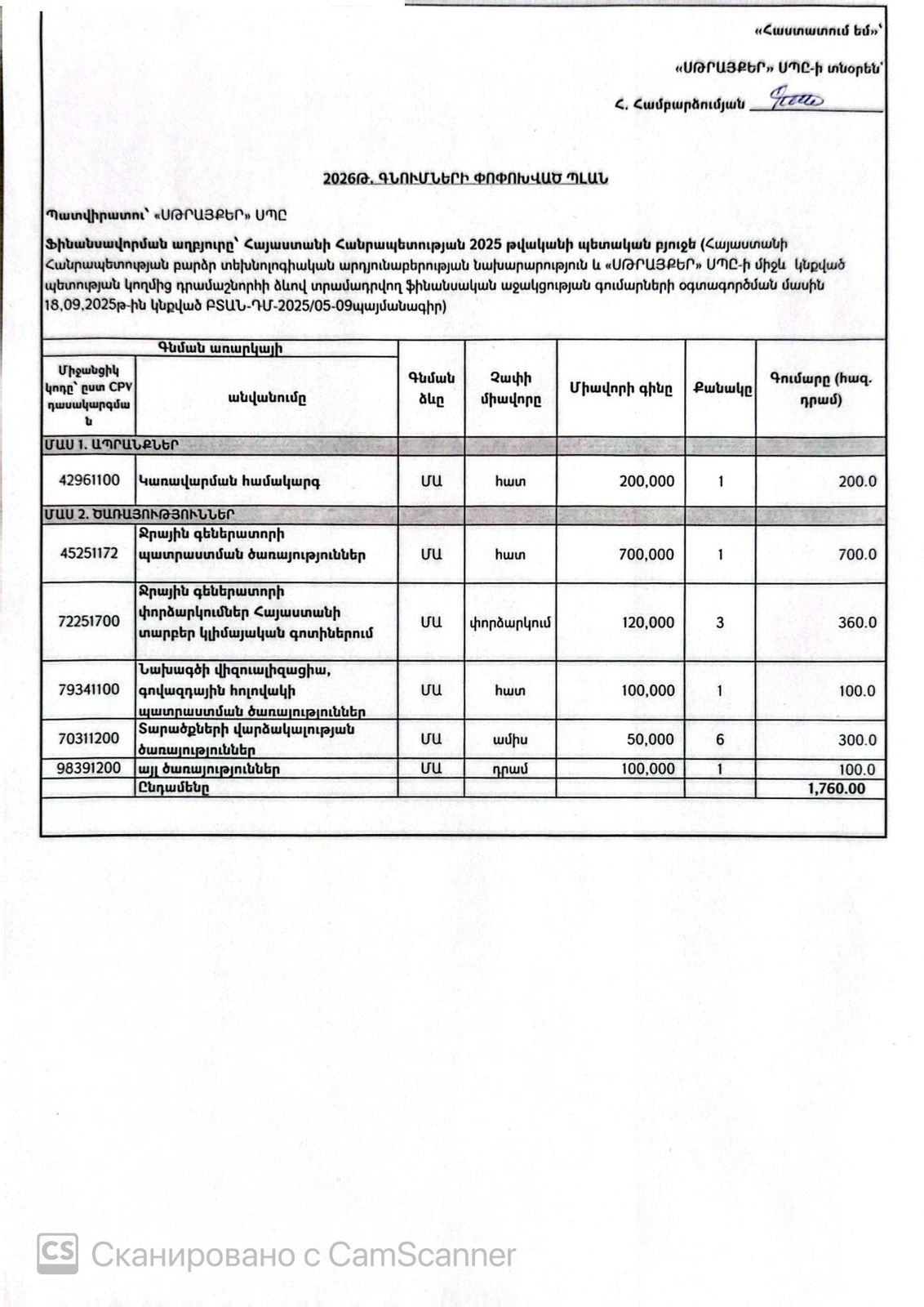 Amended and supplemented purchase plan for 2026 year of “Elektro power systems operator” CJSC