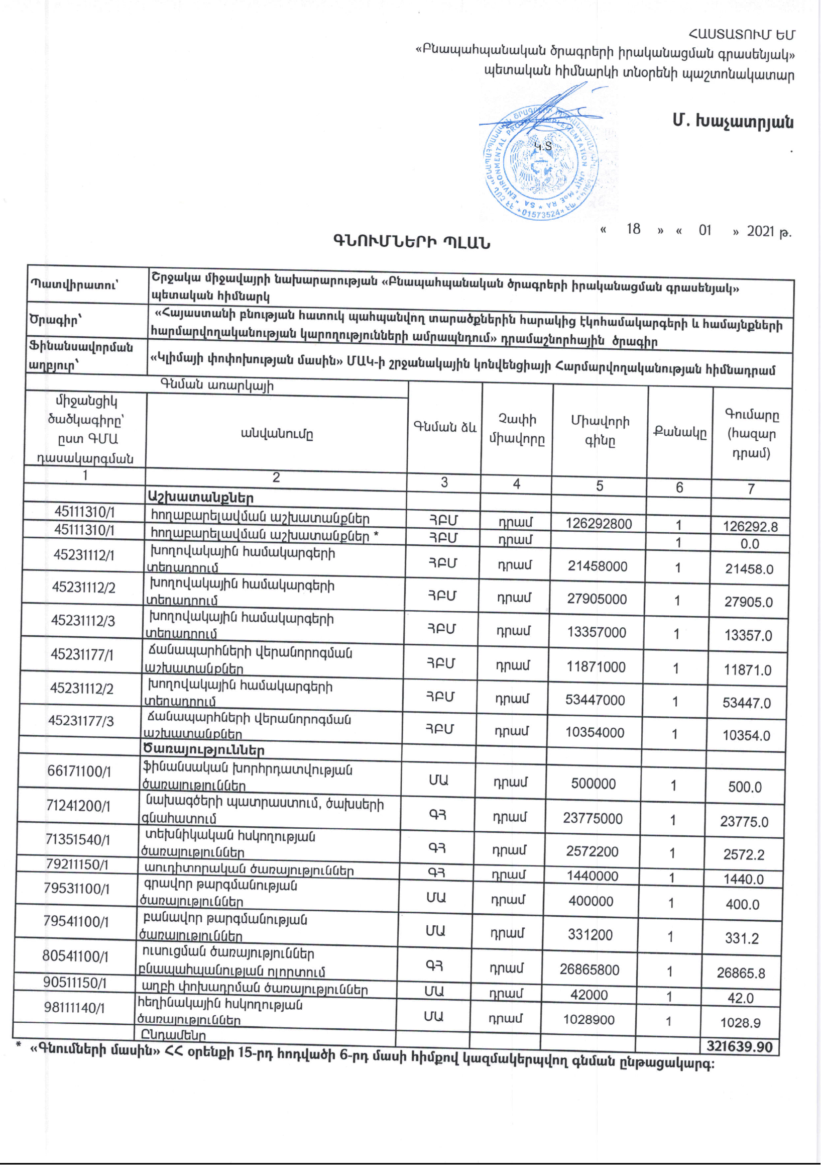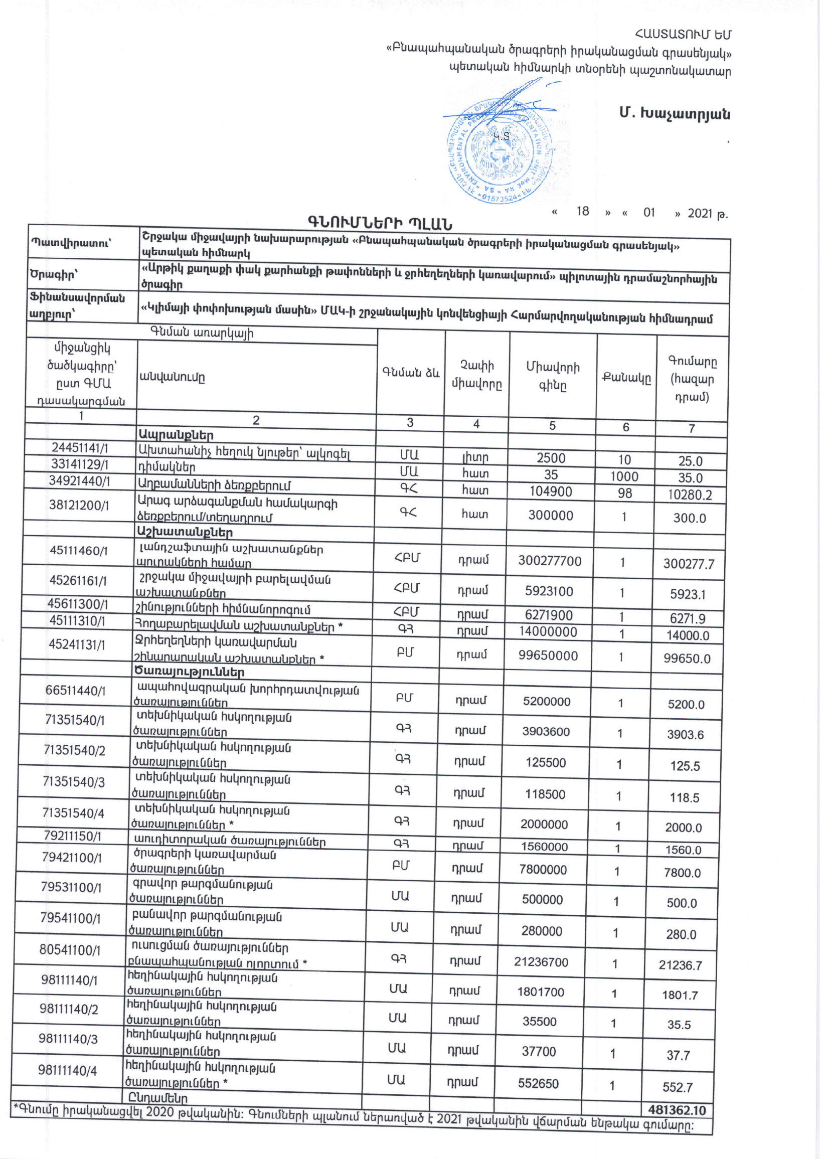 Procurement plan for 2021 for the needs ,, Kindergarden N 1 ,, NPO of Metsamor city of Armavir region , RA