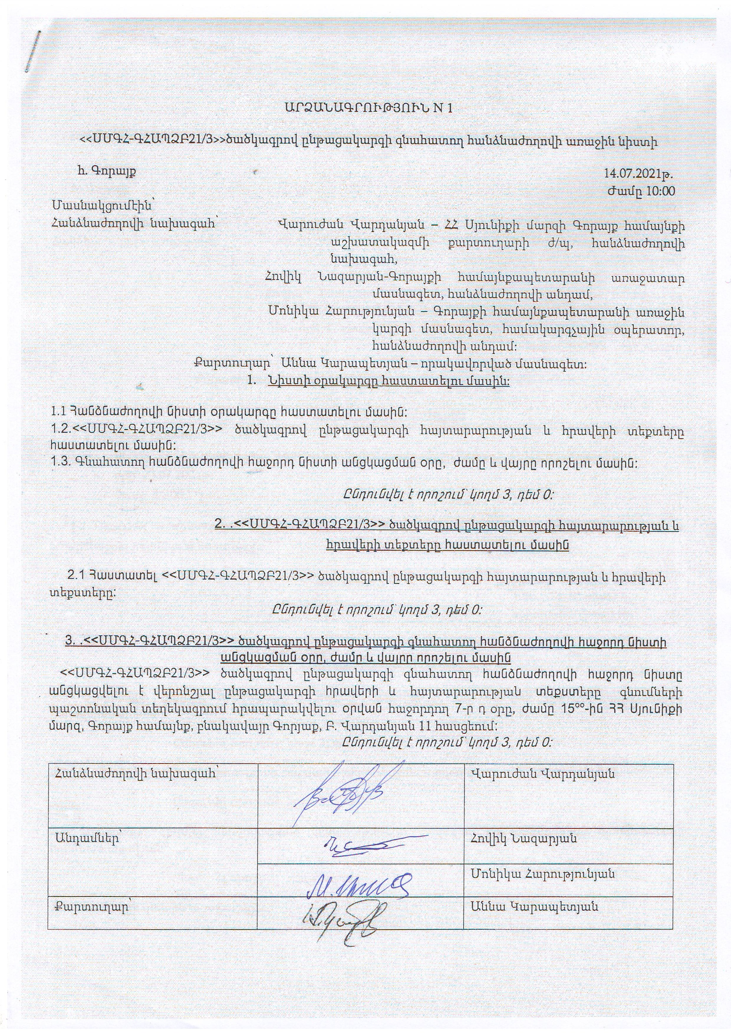 ՀՀ Սյունիքի մարզի <Գորայք համայնքապետարանի> <ՍՄԳՀ-ԳՀԱՊՁԲ21/3> ծածկագրով գնահատող հանձնաժողովի առաջին նիստի արձանագրություն
