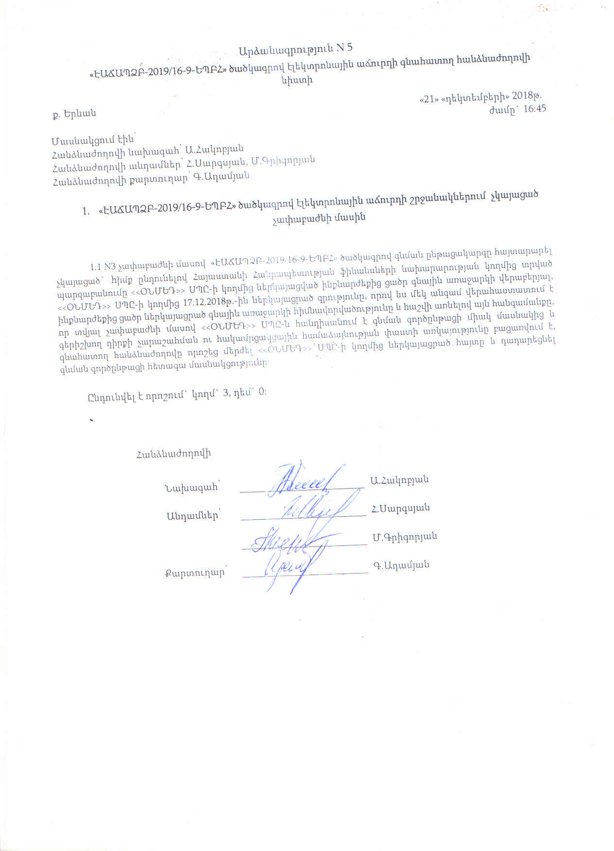 ԷԱՃԱՊՁԲ-2019/16-9-ԵՊԲՀ ծածկագրով էլեկտրոնային աճուրդի գնահատող հանձնաժողովի նիստի Արձանագրություն