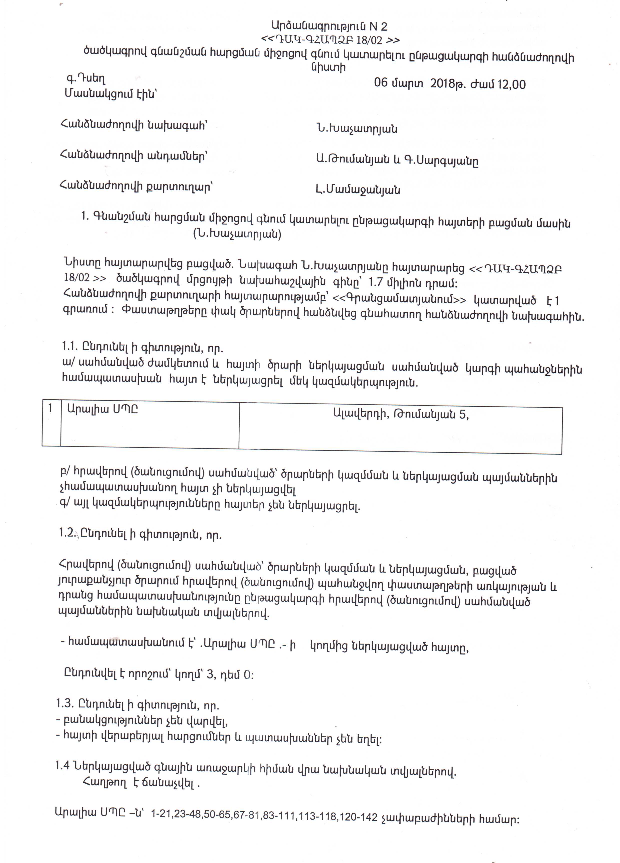 Դսեղի առողջության կենտրոն ՊՈԱԿ-ի ԴԱԿ-ԳՀԱՊՁԲ-18/02 ծածկագրով ընթացակարգի բացման նիստի արձանագրություն
