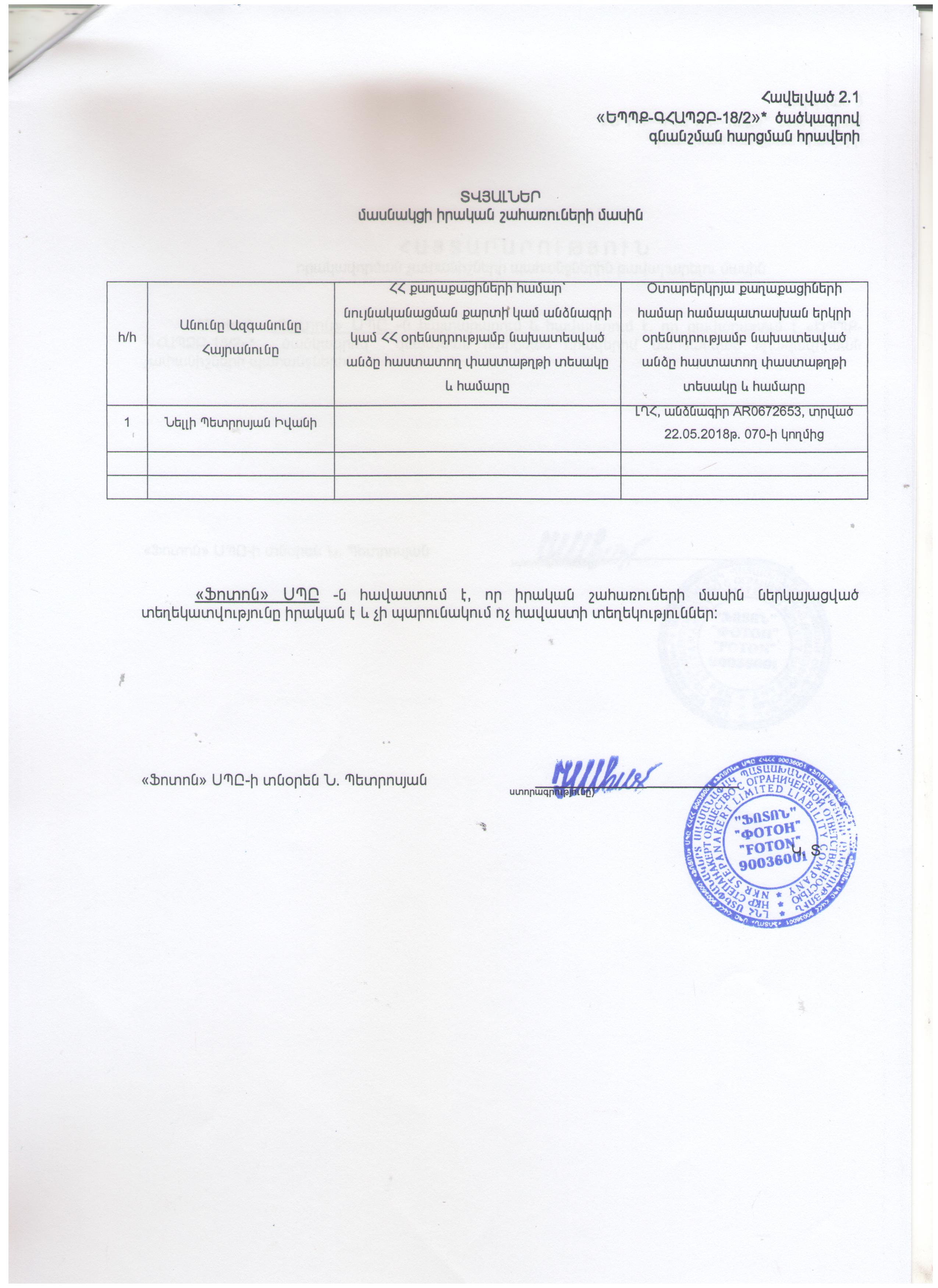«Թ15ՊՈԼ- ԳՀԱՊՁԲ-18/12» ծածկագրով գնման ընթացակարգի մասնակցի իրական շահառուների մասին հայտարարություն