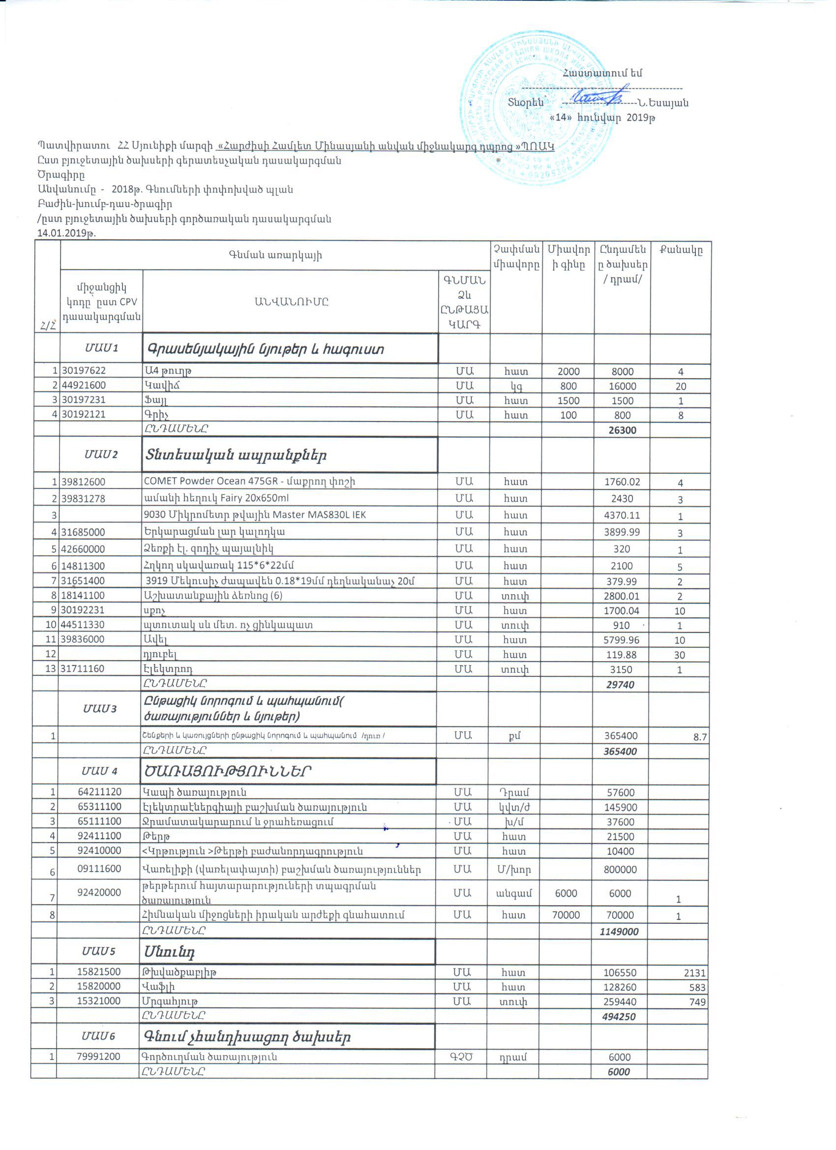 «ԿՈՄԻՏԱՍԻ ԹԱՆԳԱՐԱՆ-ԻՆՍՏԻՏՈՒՏ» ՊՈԱԿ-ի 2019թ գնումների պլան