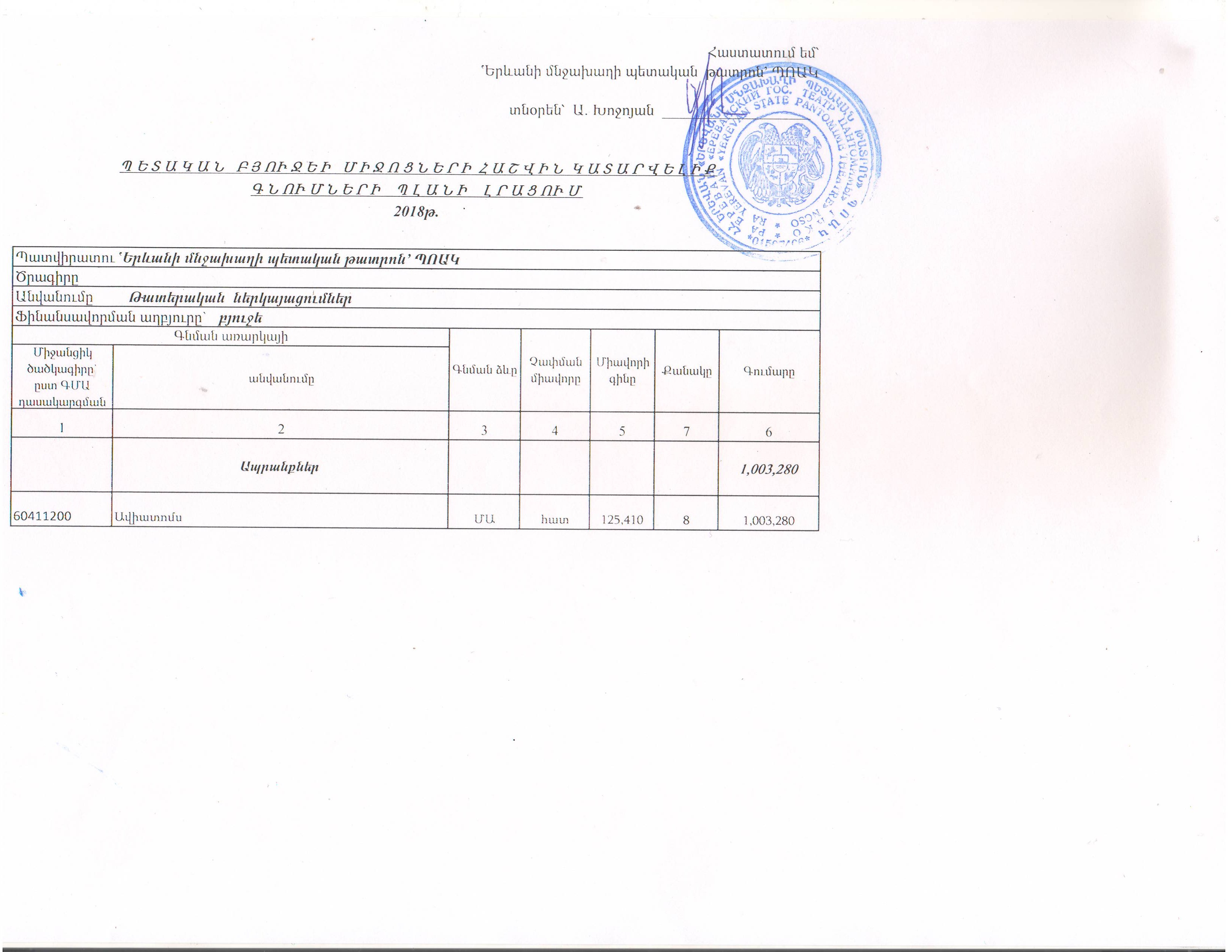 Изменения в плане закупок 2019 года для детского сада SNCO № 7 в Арташате