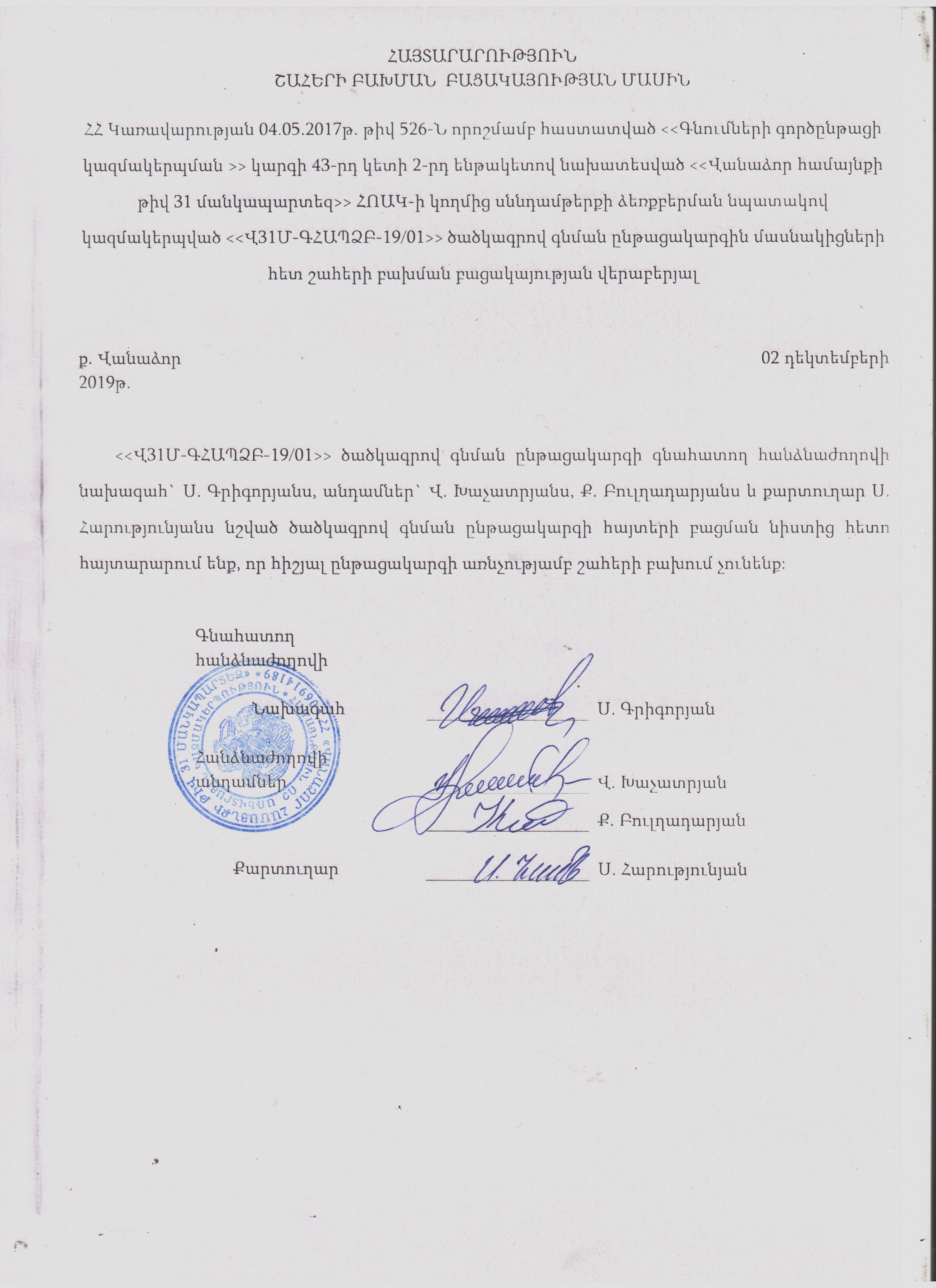 Обьявление об отсутствии конфликта интересов по коду ՀՀ ՖՆ-ԳՀԾՁԲ-19/50