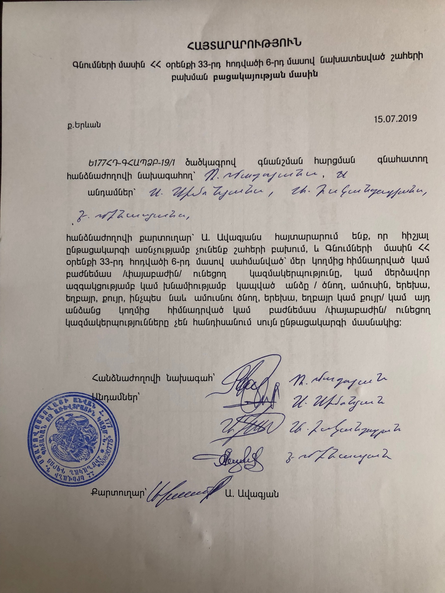 ՀՀ ԱՆ «Պրոֆ. Ռ.Օ. Յոլյանի անվան արյունաբանական կենտրոն» ՓԲԸ-ի կողմից ՅԱԿ-ԳՀԱՊՁԲ-19/89 ծածկագրով գնման ընթացակարգի գնահատող հանձնաժողովի անդամների և քարտուղարի շահերի բախման բացակայության մասին հայտարարություններ