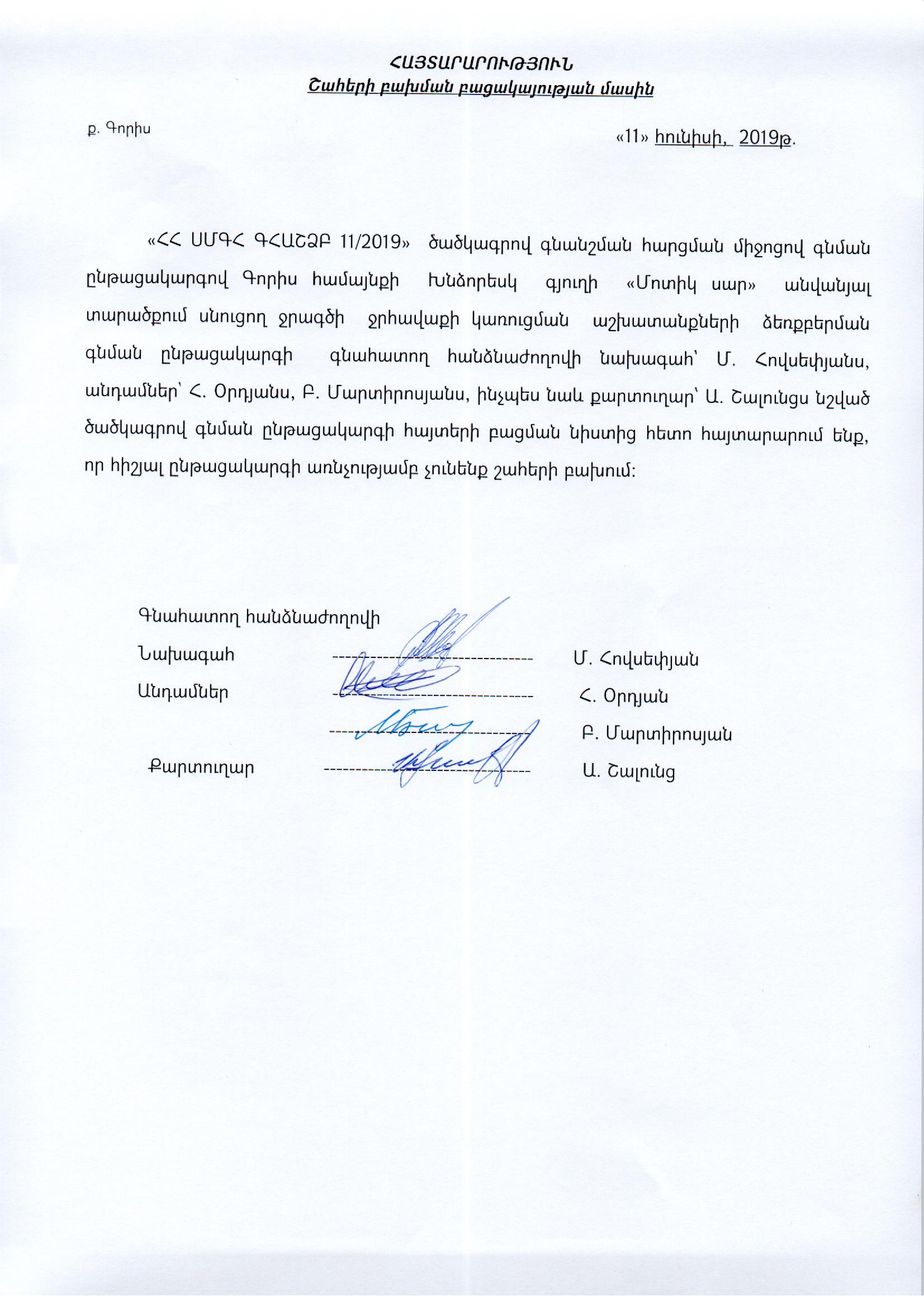 ՀՀ ԷԵԲՊՆ ջրայինկոմիտեի «Ջրառ» ՓԲԸ-ի կարիքների համար ՀՀԷԵԲՊՆՋԿ-Ջ-ԳՀԱՊՁԲ-19/13 ծածկագրով շահերի բախման բացակայության մասին հայտարարություն