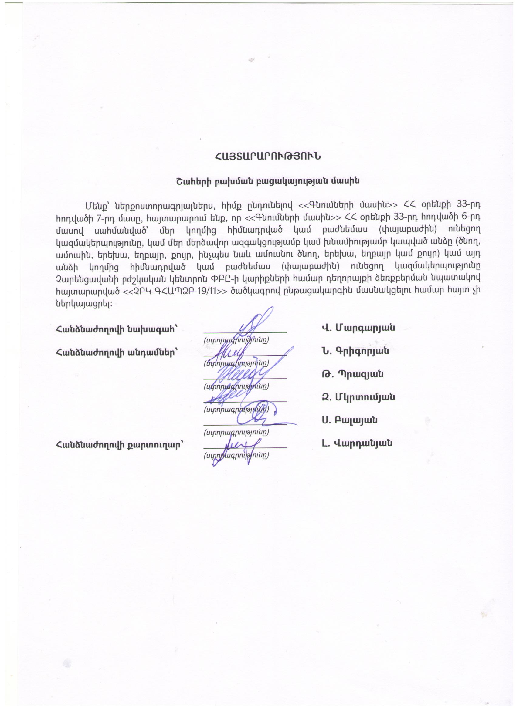 ՀՀ ԱՆ «Հիվանդությունների վերահսկման և կանխարգելման ազգային կենտրոն» ՊՈԱԿ-ի գնանշման հարցմամբ ԳՀԱՊՁԲ-ՀՎԿԱԿ-2019-35 ծածկագրով գնման ընթացակարգի գնահատող հանձնաժողովի անդամների և քարտուղարի շահերի բախման բացակայության մասին հայտարարություններ