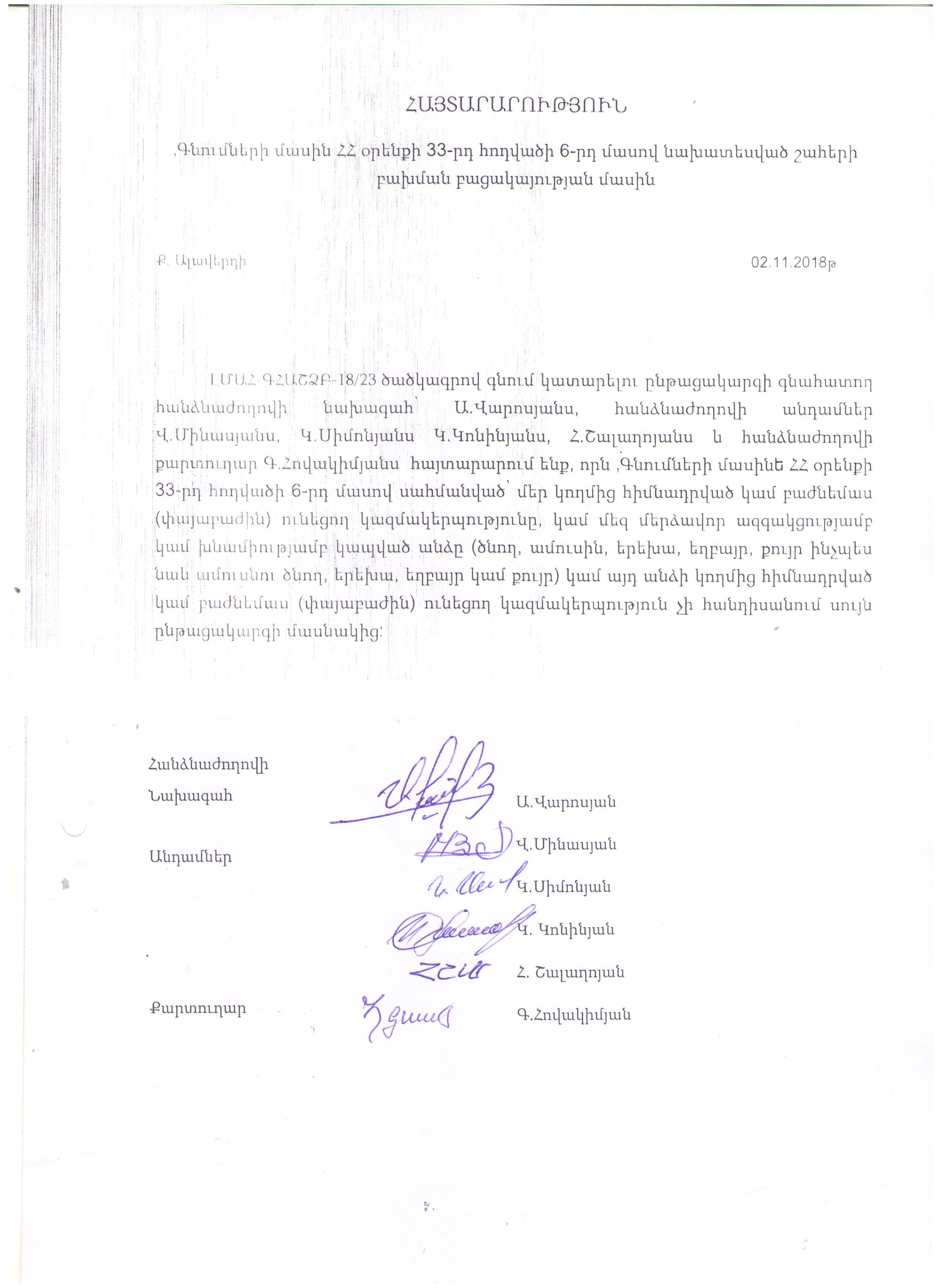 Հայաստանի տարածքային զարգացման հիմնադրամի կողմից իրականացվելիք թիվ «ՊԾԷԱ-ԱՊՁԲ-2018/1» ծածկագրով շահերի բախման բացակայության մասին ՀԱՅՏԱՐԱՐՈՒԹՅՈՒՆ