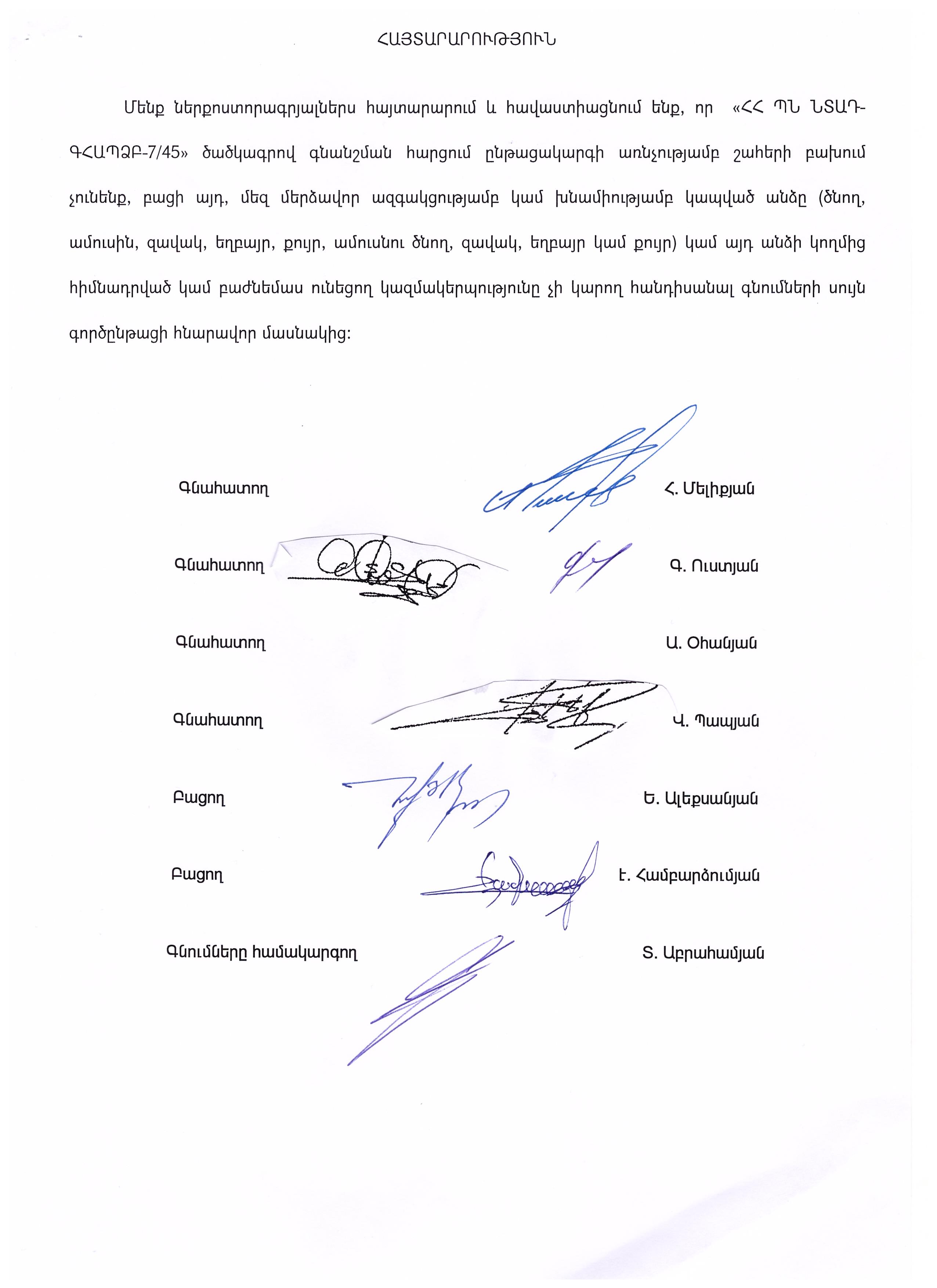 Заявление об отсутствии столкновения интересов комиссии по оценке процедуры проведения викторины Тендерная процедура для ԱՄՇԱՄԿ–ԳՀԱՇՁԲ-18 /06, объявленная для нужд культурного центра после Шарля Азнавура в Арташате
