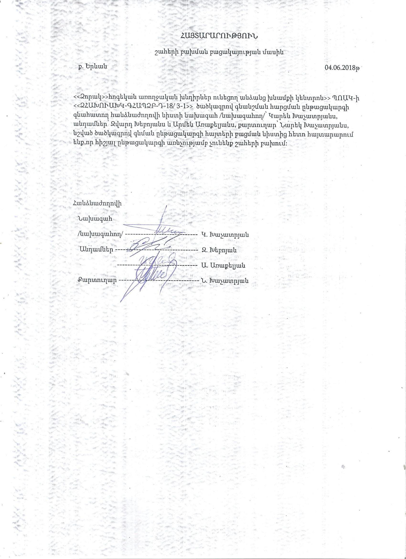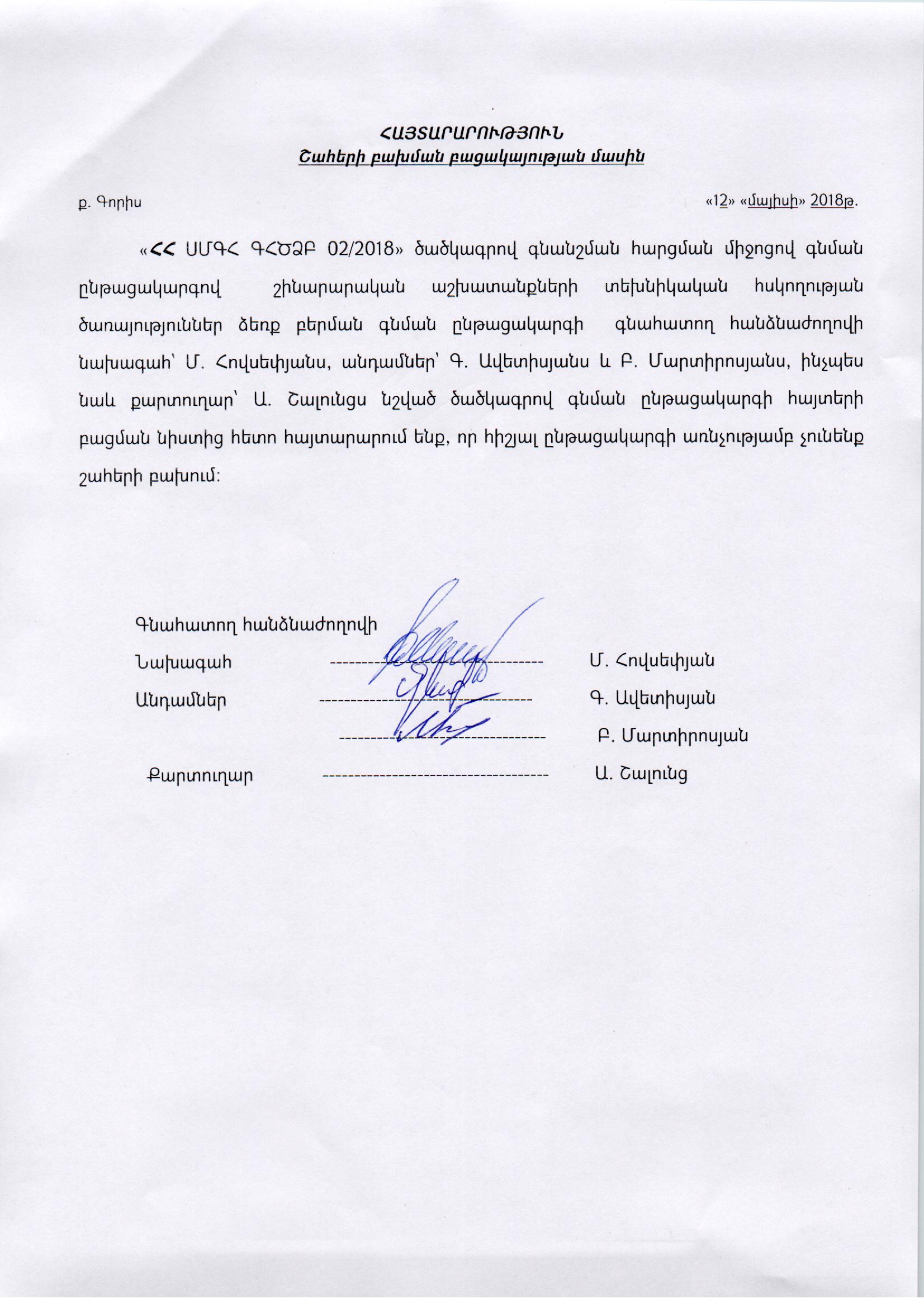 Քաջարանի համայնքապետարանի կարիքների համար շինարարական աշխատանքների ձեռքբերման նպատակով հայտարարված մրցույթի հայտերի բացման նիստում շահերի բախման բացակայության մասին հայտարարություն