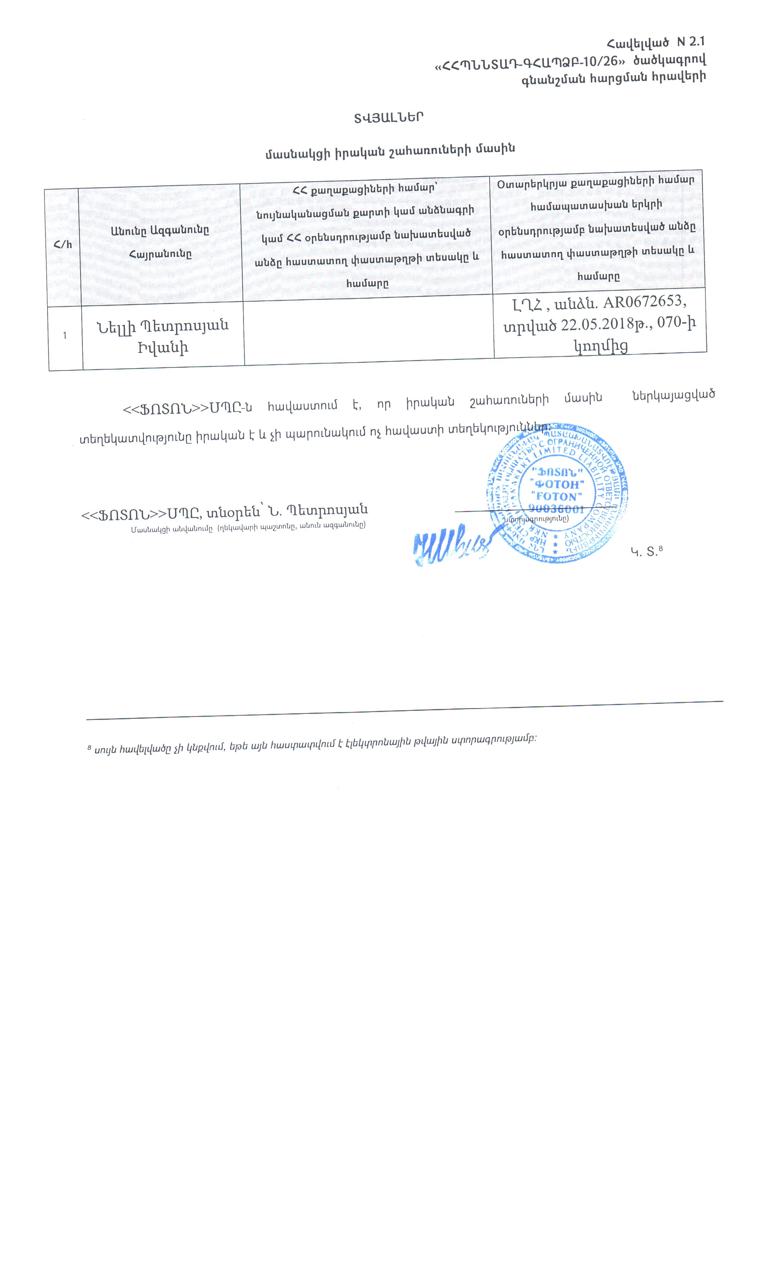 « ՀՀ ՊՆ ՆՏԱԴ-ԳՀԱՊՁԲ-10/26 » ծածկագրով ընթացակարգի շրջանակներում մասնակցի իրական շահառուների տվյալների մասին հայտարարություն