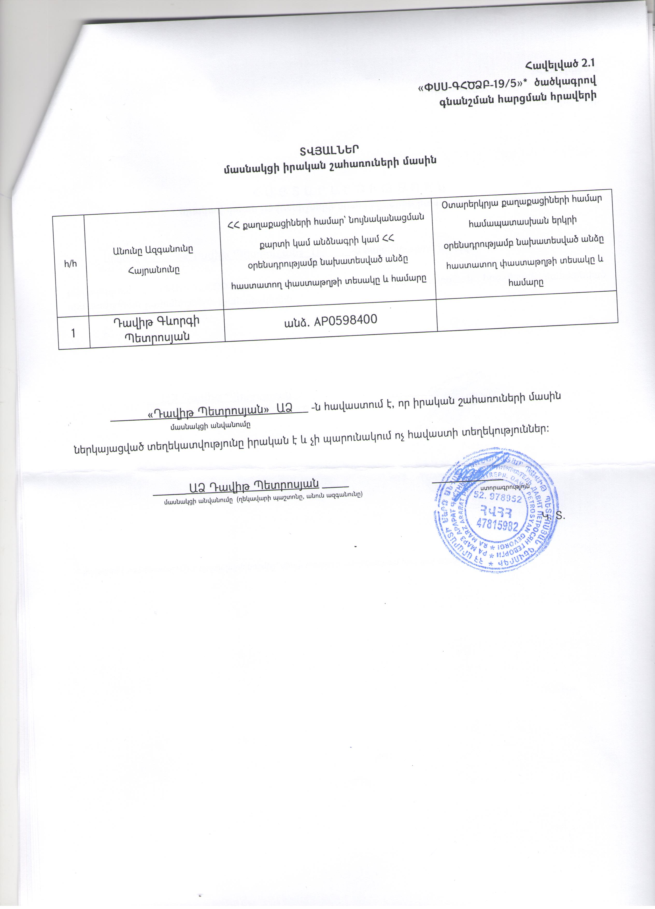 ՓՍՍ-ԳՀԾՁԲ-19/5 ծածկագրով գնման ընթացակարգի ընտրված մասնակցի իրական շահառուների տվյալներ