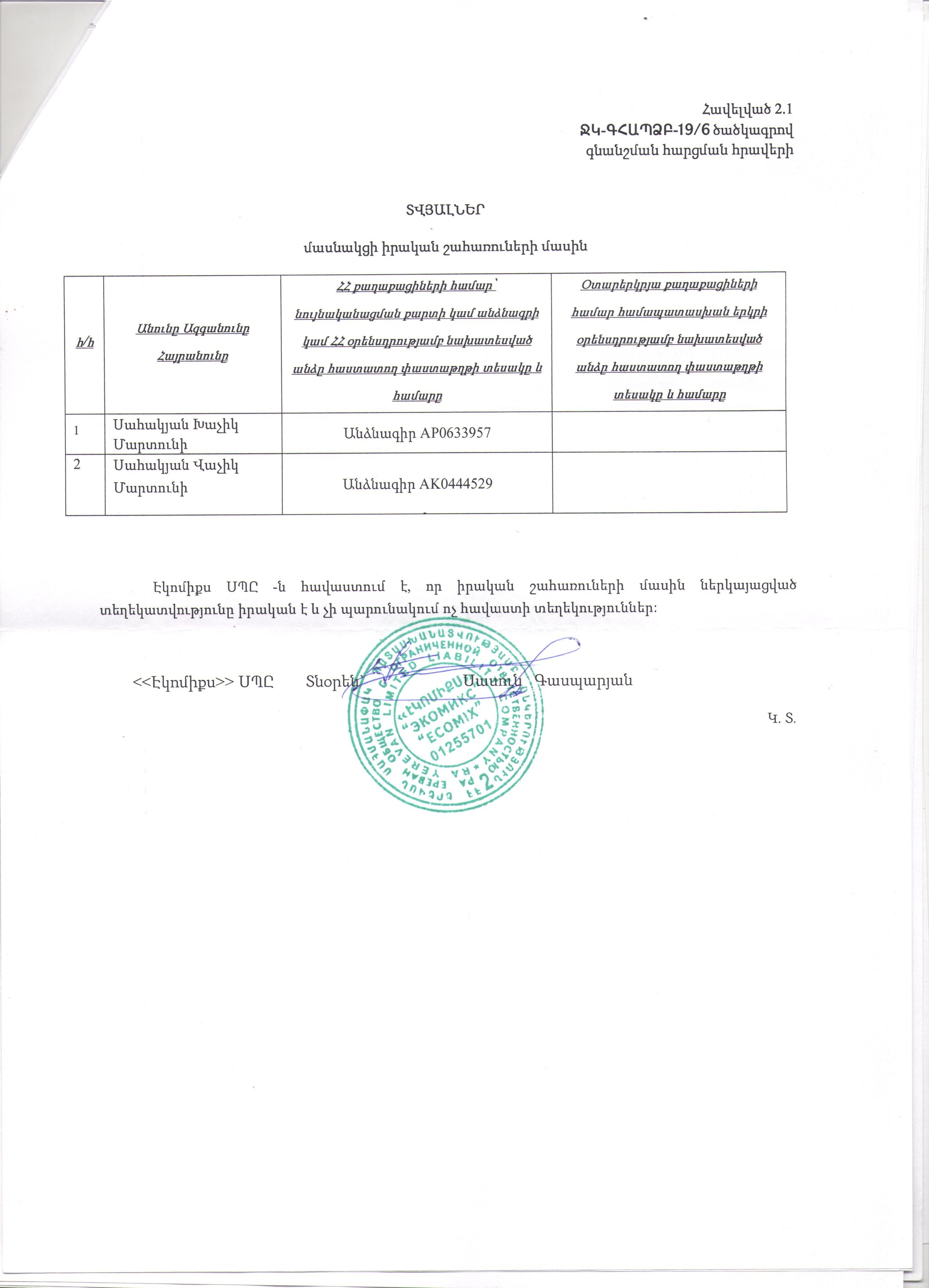 ՋԿ-ԳՀԱՊՁԲ-19/6 ծածկագրով գնման ընթացակարգի ընտրված մասնակցի իրական շահառուների տվյալներ